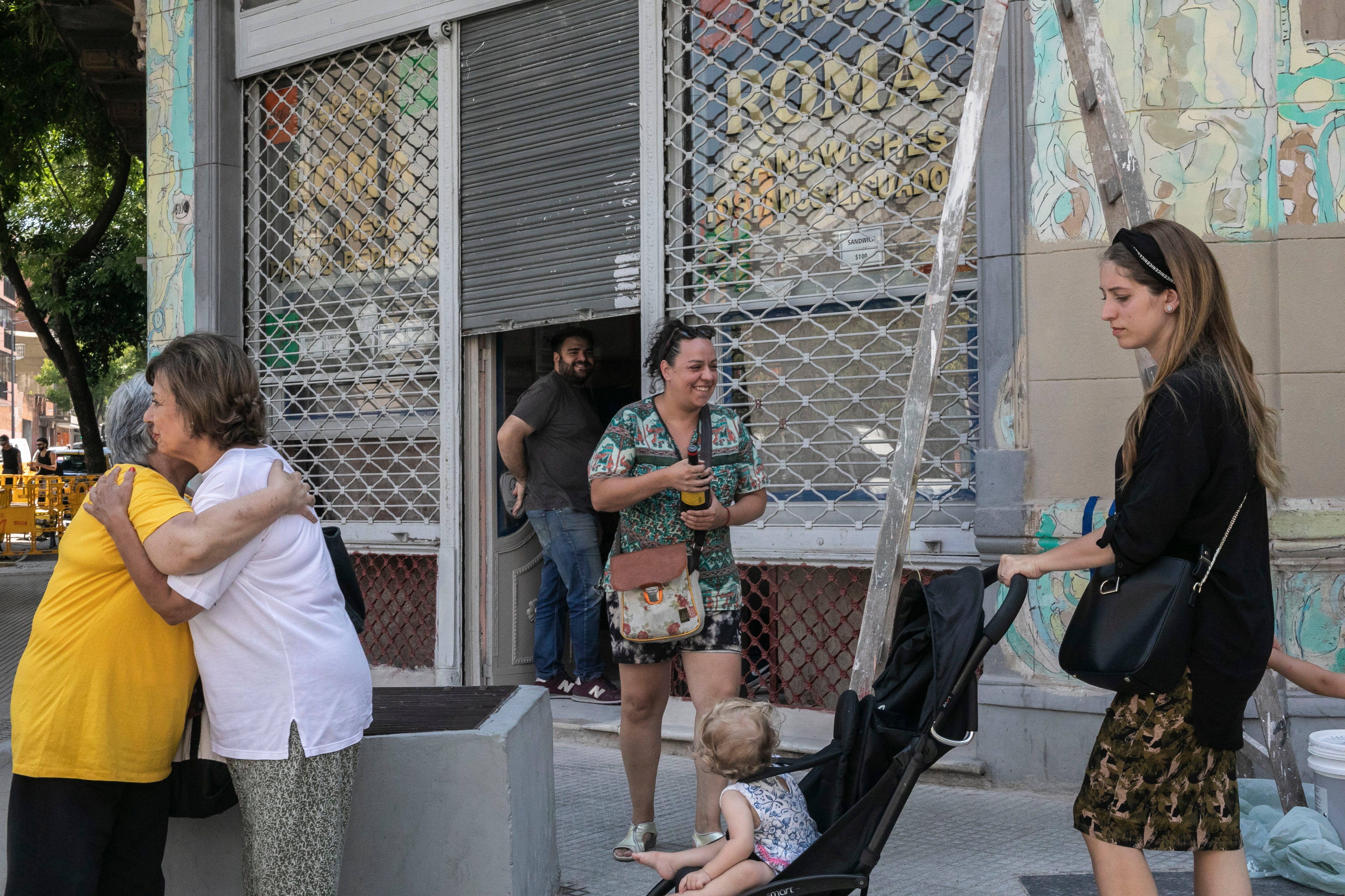 También está esta foto que nos encanta, que es una joya por todo lo que está pasando al mismo tiempo. El bar con la persiana a media asta y Julián, uno de nuestros socios y fundadores, sonriendo con la mirada en la vereda. El abrazo de dos mujeres. El bebé que observa lo que está pasando desde el cochecito. Las paredes, con la pintura que hizo, como regalo, el dueño de la cerrajería de enfrente y de la que dejamos un recorte cuando le devolvimos el bar su color original. En el vidrio, algunas palabras inoxidables: Roma, café bar, sándwiches, tostados y licuados.